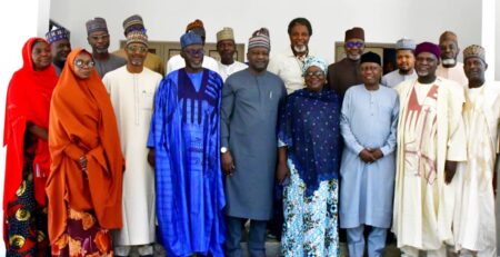 With me are; Engr. Adam Bukar Bababe, Executive Secretary, Borno Geographic Information Service (BOGIS); Musa Mustapha Zarma, Director General, Borno State Bureau for Public Procurement; and Haj. Maryam Shehu, Acting Director General, Borno State Investment Promotion Agency.